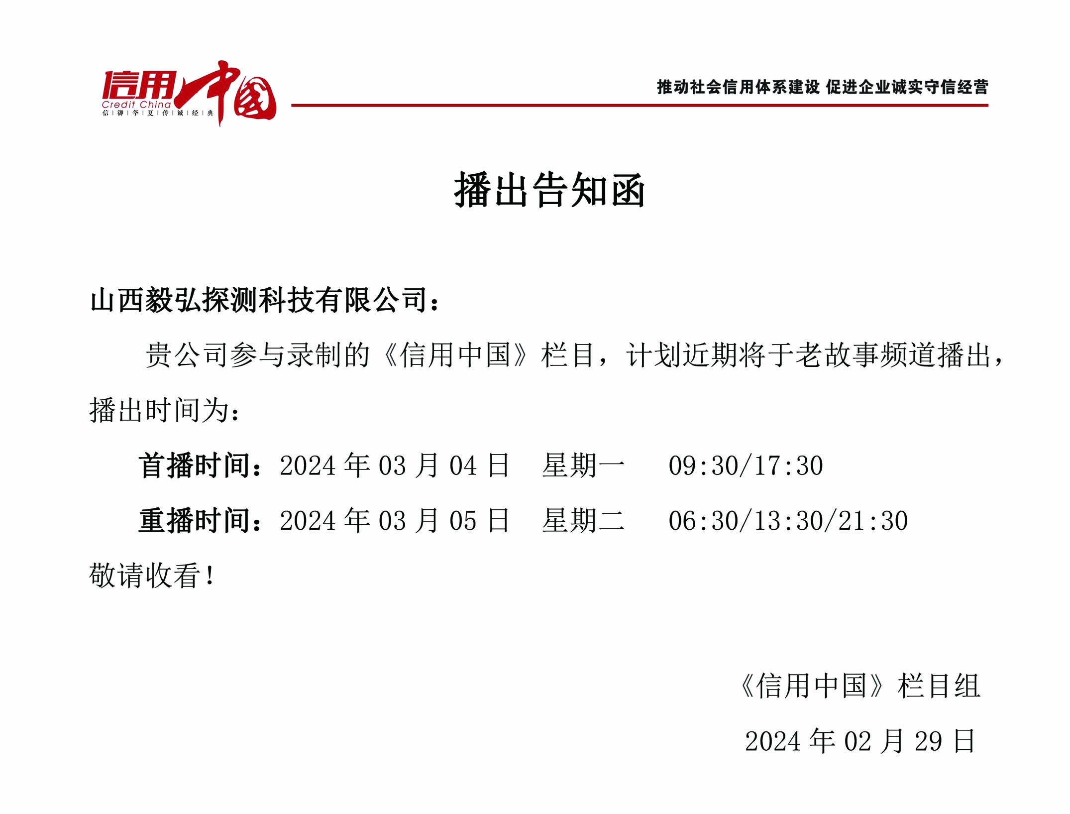 公司董事长司宝锋先生受邀录制的央视节目“立足气象中国芯,助力气象强国新征程”即将于2024年3月4日9:30在央视老故事频道播出,届时敬请收看。https://mp.weixin.qq.com/s/QsD4mlvt-o7126gCD5-UOQ